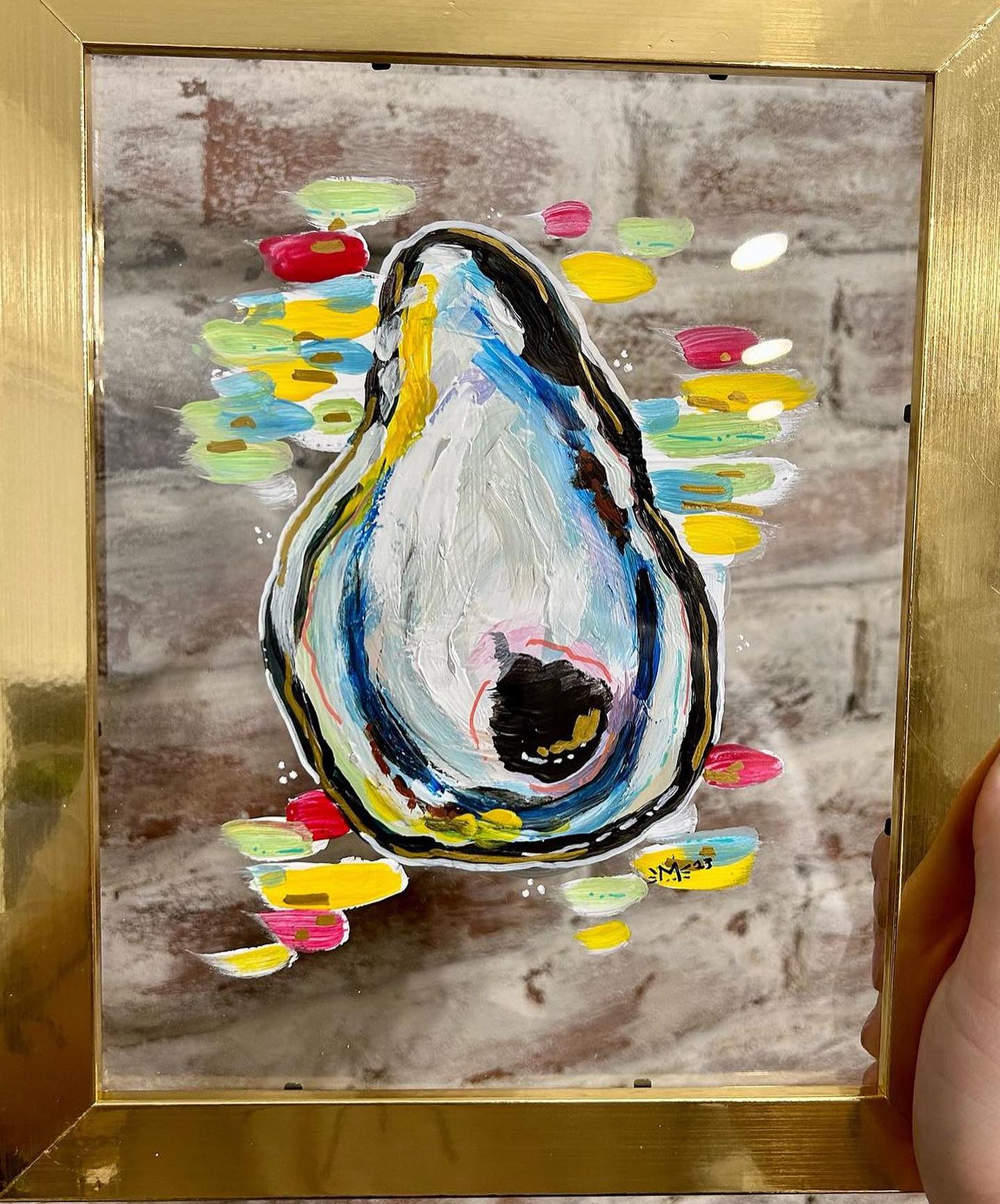 Oyster painted on golden frame with acrylic paints. Painting is inbetween two layers of plastic.